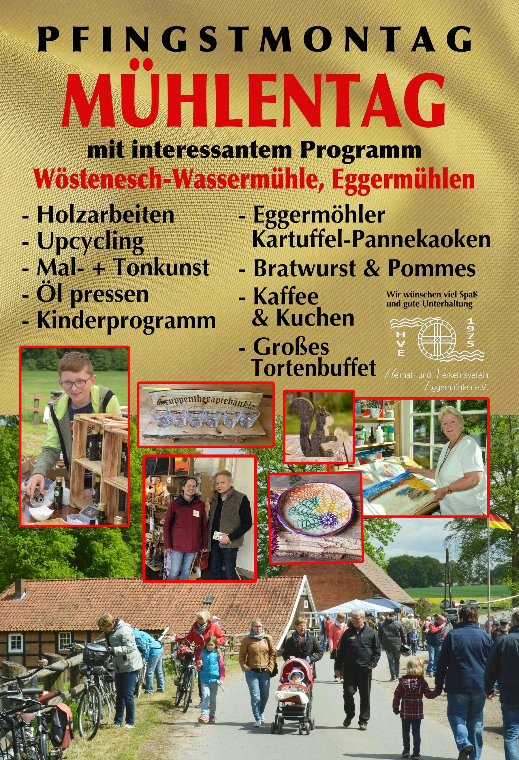 In der Veranstaltungsreihe „Heimat in froher Runde“ führt eine Halbtagesfahrt am 19. April zu einer Besichtigung des Klosters Kroge. Am 3. Mai sowie am 2. August erfolgt ein gemeinsames Volksliedersingen mit den Heimatfreunden aus Kettenkamp. Die Radwanderung führt am 18. Juni nach Merzen. Am 21. Juni findet in der Wösternesch-Wassermühle ein plattdeutscher Gottesdienst statt. Eine Familienwanderung ist am 9. Juli geplant und bei einem Tagesausflug am 31. August werden die Friedensstadt Münster sowie Naturagart in Ibbenbüren besucht. Fortgesetzt mit zehn weiteren „Eggermühlener Originalen“ wird die Veranstaltung „Herbstgeflüster“ am 17. September in der Wassermühle. Ein Filmnachmittag am 20. September rundet das aktuelle Vereinsprogramm ab.